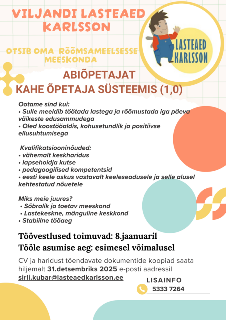 Viljandi Lasteaed Karlsson – abiõpetaja kahe õpetaja süsteemis (1,0)
